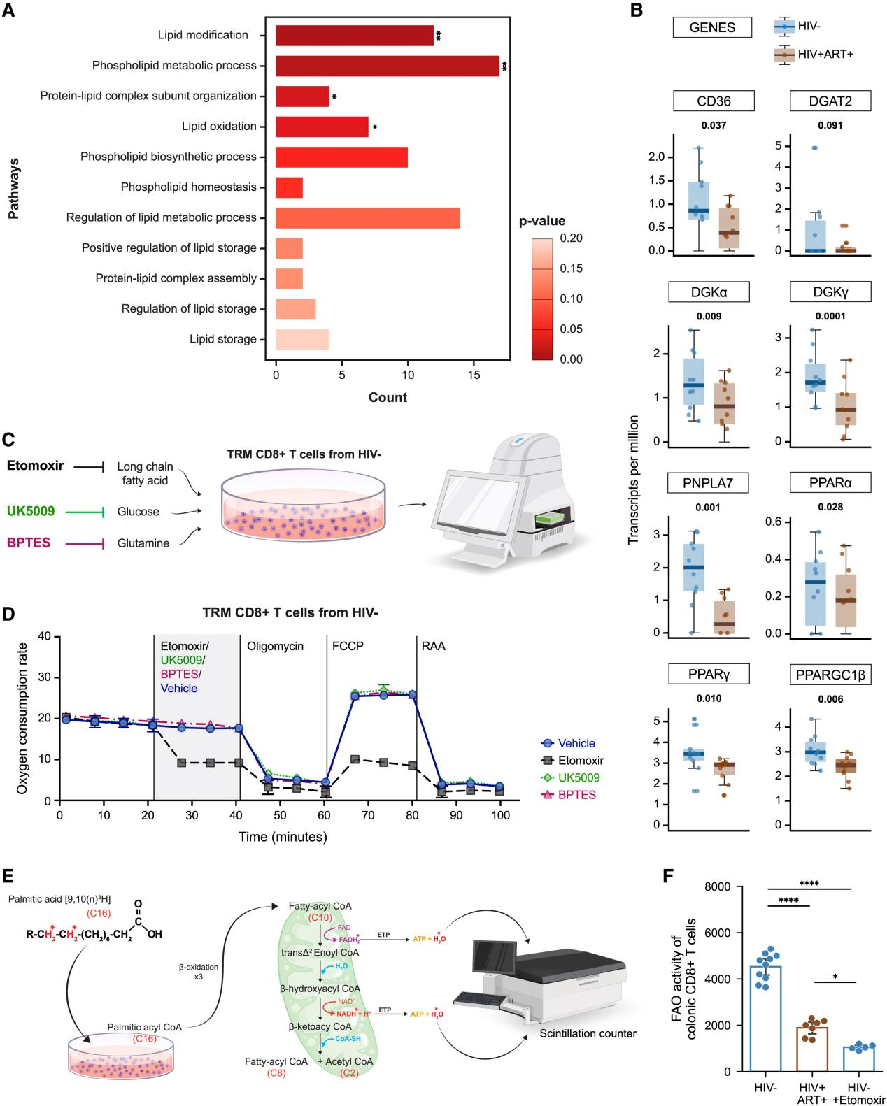 進(jìn)一步了解PWH結(jié)腸TRM CD8 T細(xì)胞的功能差異,作者進(jìn)行差異基因表達(dá)分析,發(fā)現(xiàn)多個(gè)脂質(zhì)代謝相關(guān)基因和通路下調(diào)。相關(guān)基因的下調(diào),以及其他的PPAR家族成員表達(dá)的減少,突顯了PWH中結(jié)腸TRM CD8 T細(xì)胞脂質(zhì)代謝途徑的破壞。作者通過(guò)在體外培養(yǎng)來(lái)自未感染的TRM CD8 T細(xì)胞中分別加入Etomoxir(抑制脂肪酸氧化)、BPTES(阻斷谷氨酰胺代謝)、UK5009(阻斷葡萄糖代謝),發(fā)現(xiàn)結(jié)腸TRM CD8 T細(xì)胞的線粒體氧化代謝不受其他代謝底物(如葡萄糖或谷氨酰胺)缺失的影響,依賴FAO(脂肪酸氧化),放射性示蹤技術(shù)也驗(yàn)證這個(gè)發(fā)現(xiàn)。綜上所述,來(lái)自PWH的結(jié)腸TRM CD8 T細(xì)胞高度依賴 FAO。