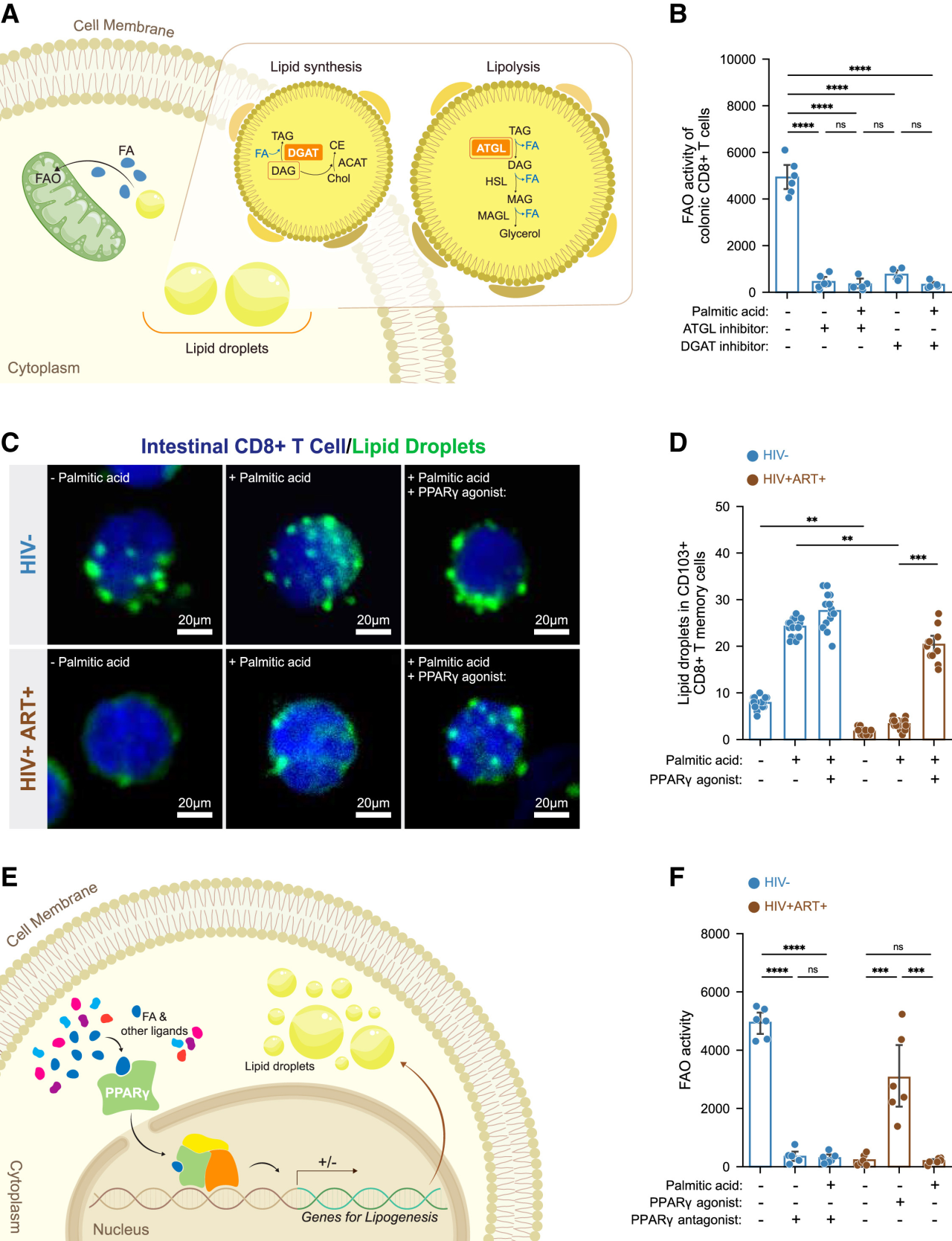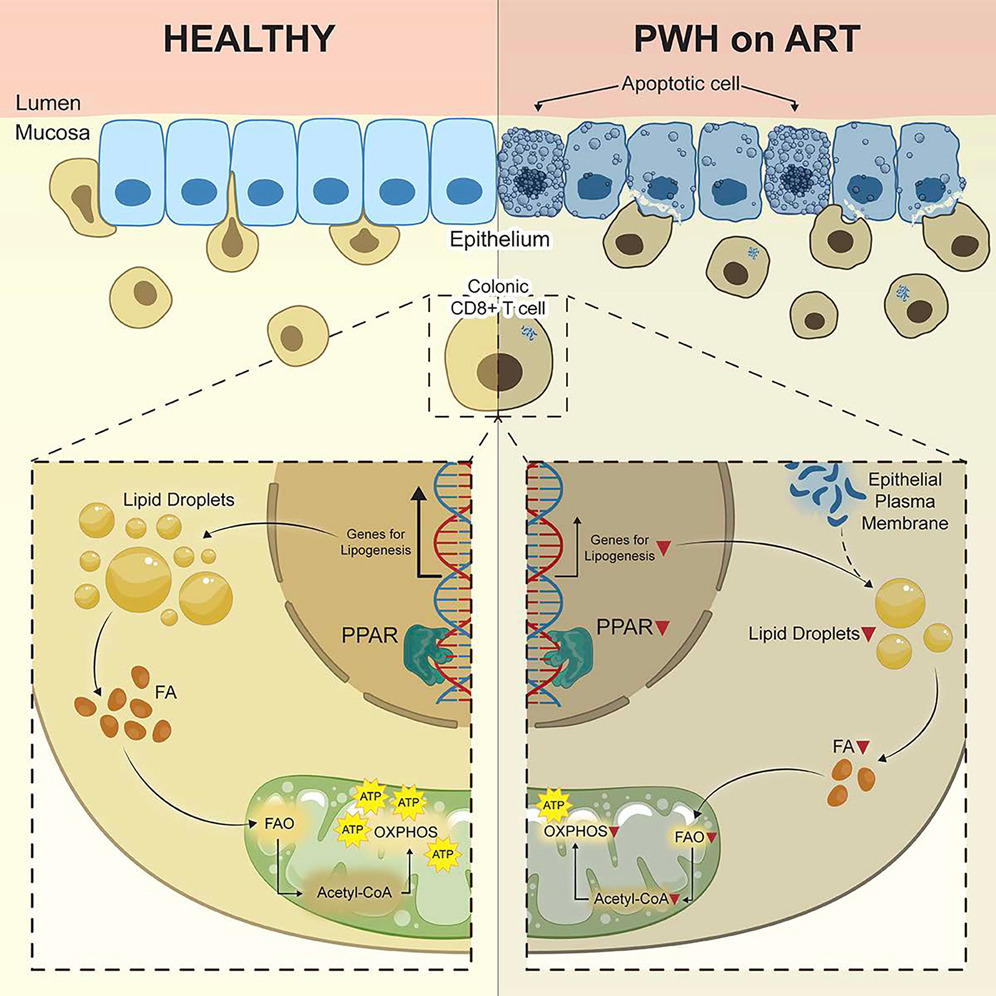 HIV感染的一個(gè)標(biāo)志是腸道屏障完整性的破壞,盡管接受了抗逆轉(zhuǎn)錄病毒療法(ART)治療,但HIV感染者(PWH)仍然存在。這種破壞是艾滋病毒疾病進(jìn)展的核心,但原因仍不完全清楚。作者報(bào)道了一種機(jī)制,即PWH中結(jié)腸駐留 CD8 T細(xì)胞的免疫代謝缺陷導(dǎo)致腸上皮細(xì)胞凋亡和腸道屏障完整性破壞。在PWH中,這些細(xì)胞下調(diào)PPARγ,導(dǎo)致細(xì)胞內(nèi)脂滴減少,脂肪酸氧化受損,以及CD8 T細(xì)胞從腸上皮細(xì)胞獲取脂質(zhì),然后導(dǎo)致上皮細(xì)胞死亡,結(jié)腸CD8 T細(xì)胞的HIV相關(guān)免疫代謝失調(diào)導(dǎo)致腸上皮穩(wěn)態(tài)喪失,這些結(jié)果確定了減少PWH和其他腸道屏障完整性破壞的疾病的合并癥的潛在策略。