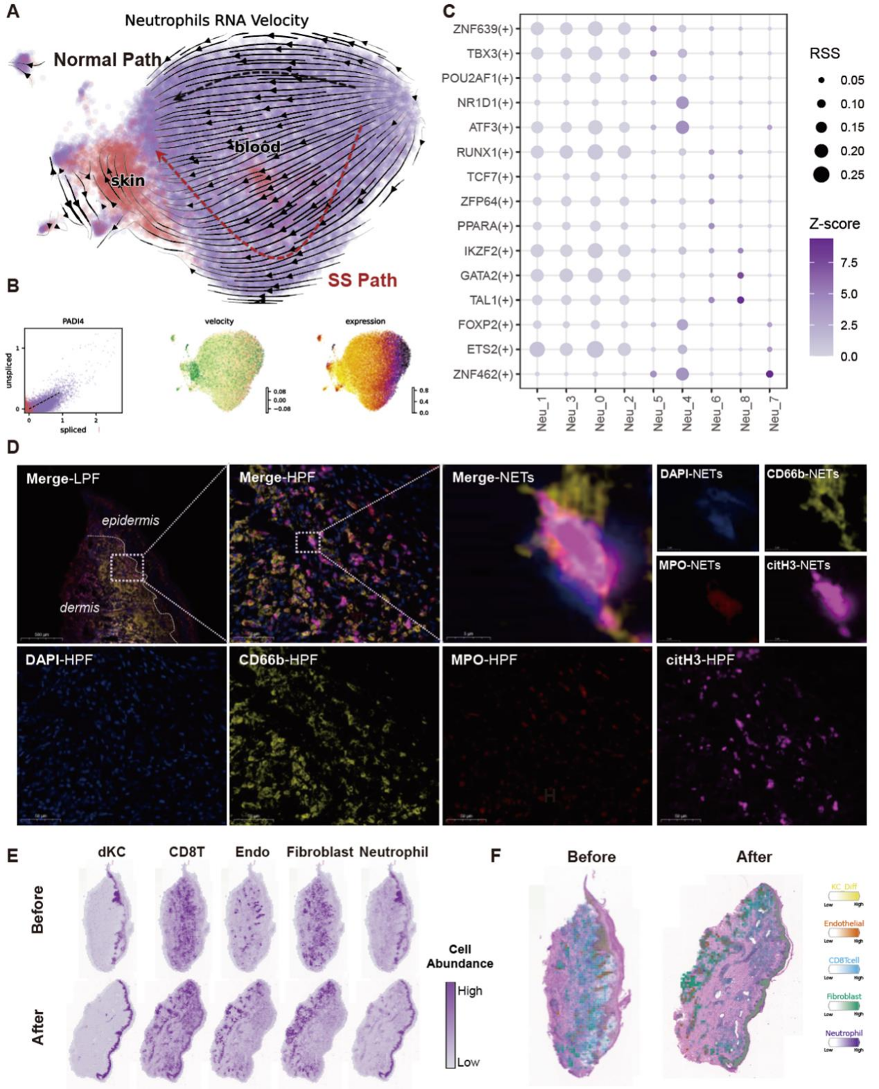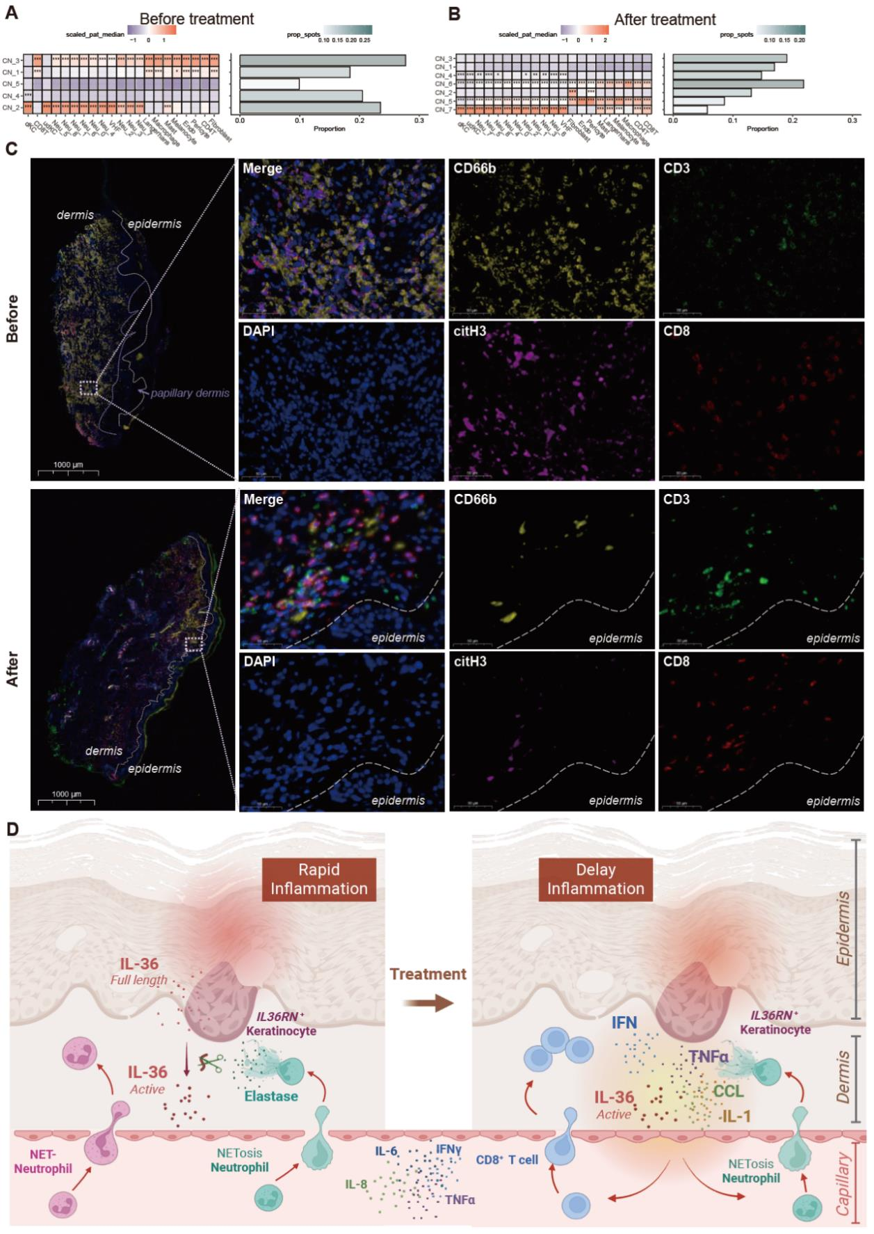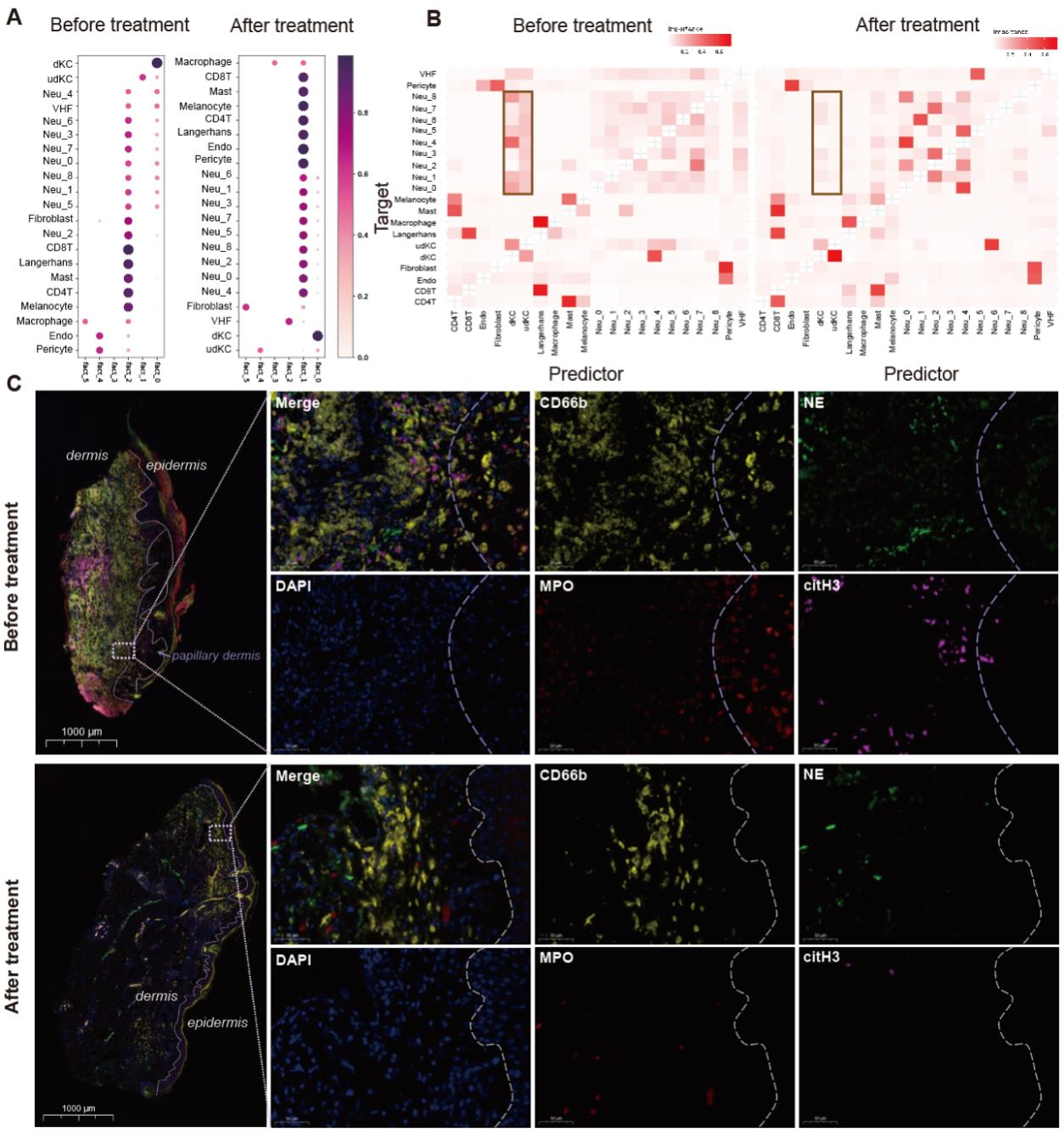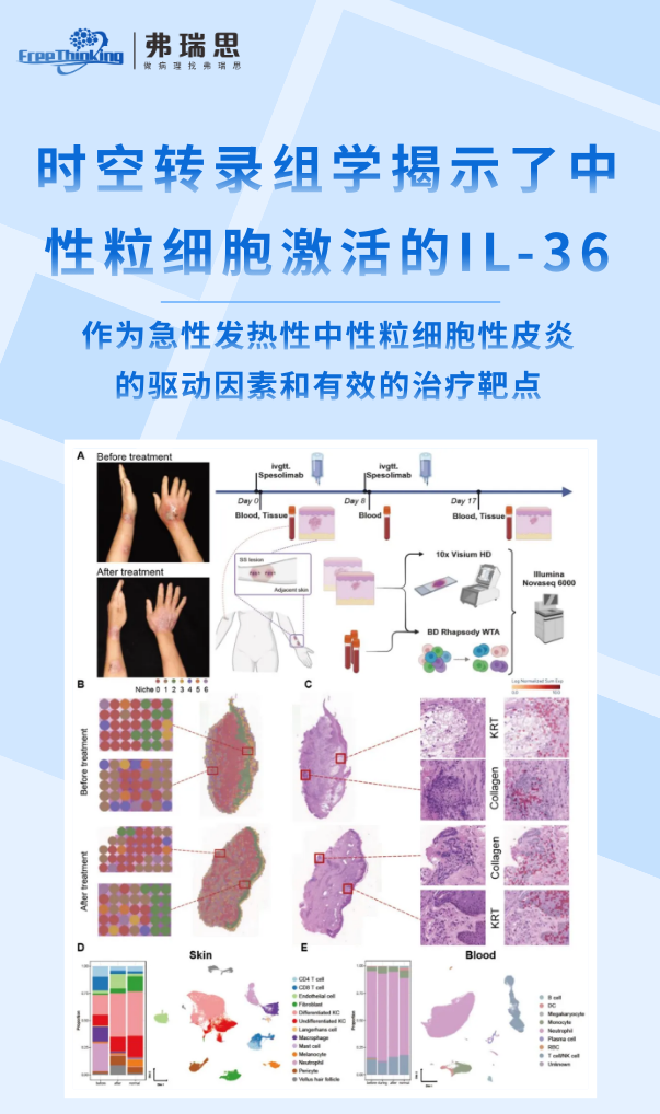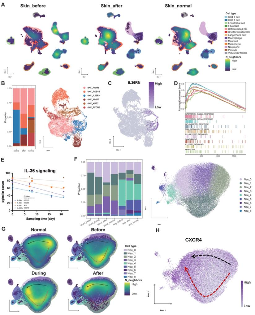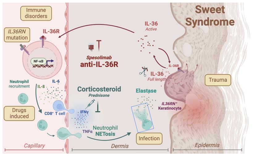 基于對急性發熱性中性粒細胞性皮炎的開創性研究及前期認知,作者構建了前向研究框架,通過兩種不同機制解析其病理生理學并制定治療策略:IL-36信號通路(使用抗IL-36R單克隆抗體)與其他全身性細胞因子信號通路(使用全身性皮質類固醇)。此外,作者補充了病理機制與病因學研究。首先,在所有接受Spesolimab治療的患者中,均排除了IL36RN功能缺失突變。隨后,IL36RN陽性的樹突狀細胞(dKC)和中性粒細胞中,細胞因子相關通路顯著上調,為細胞因子功能提供了證據。細胞因子紊亂可解釋由樹突狀細胞(KC)引發的傷口誘導型急性發熱性中性粒細胞性皮炎和免疫細胞藥物誘導型急性發熱性中性粒細胞性皮炎,這兩種類型也是急性發熱性中性粒細胞性皮炎的常見病因。此外,感染是中性粒細胞募集的典型誘因,也是NETosis的驅動因素,最終可能引發急性發熱性中性粒細胞性皮炎。